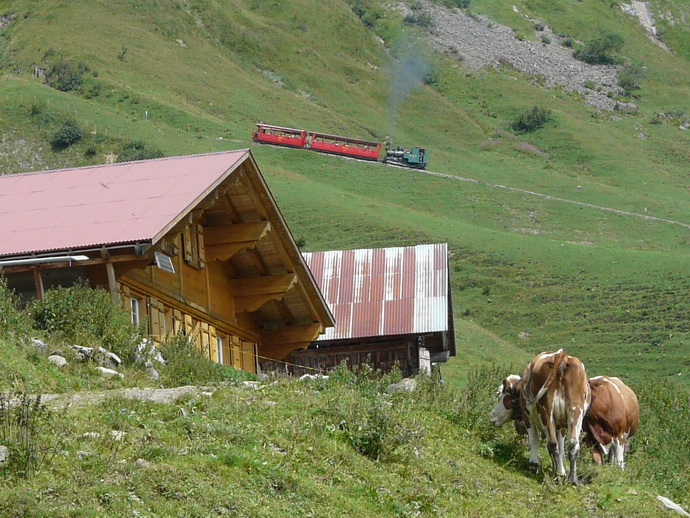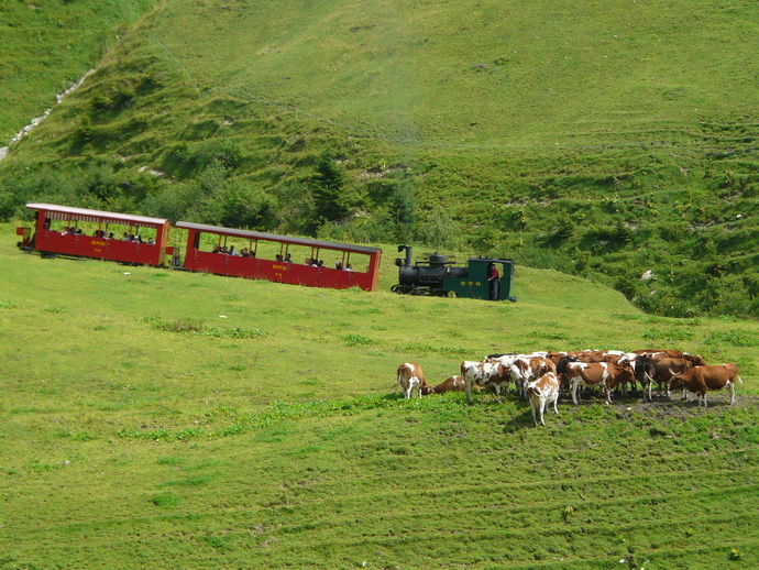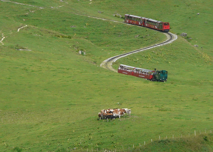 65. Las vacas son testigos de las circulaciones del tren de cremallera. Las hemos encontrado en la mayoría de los trenes de cremallera por los que hemos circulado como el Rigi, el Furka, etc. etc.