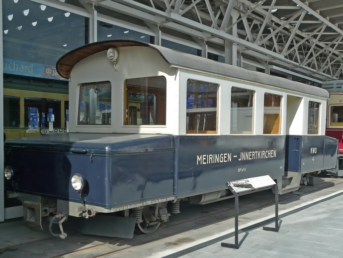 77. Precisamente en el Museo del transporte de Lucerna podemos contemplar un antiguo automotor perteneciente a la línea Meiringen–Innertkirchen Bahn. Se trata de un automotor de notación BDa 2/2 fabricado por la compañía SAAS SIG en 1939 para la compañía KWO, Kraftwerke Oberhasli, una empresa hidroeléctrica que utilizara la línea para la construcción de una presa. La línea, hoy electrificada, también discurre sobre ancho de 1000 mm, pero no podían intercambiarse unidades de una a otra por la diferente electrificación que usan las dos líneas que confluyen en Meiringen.