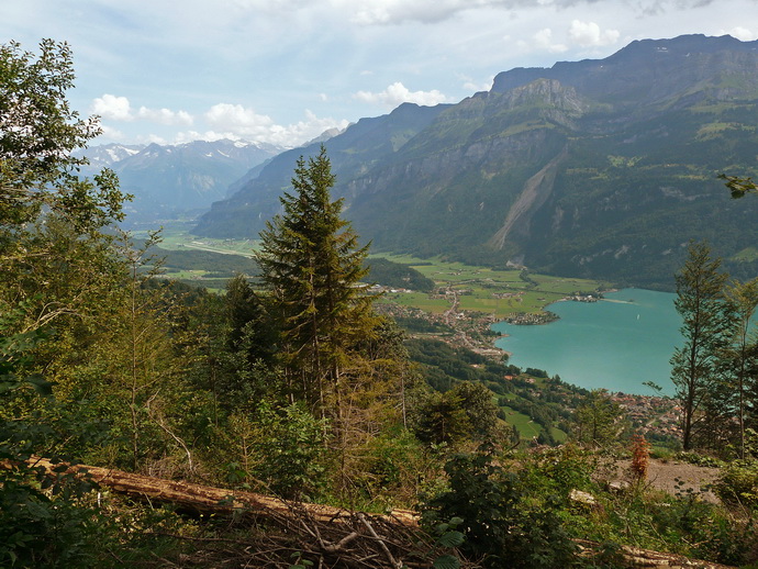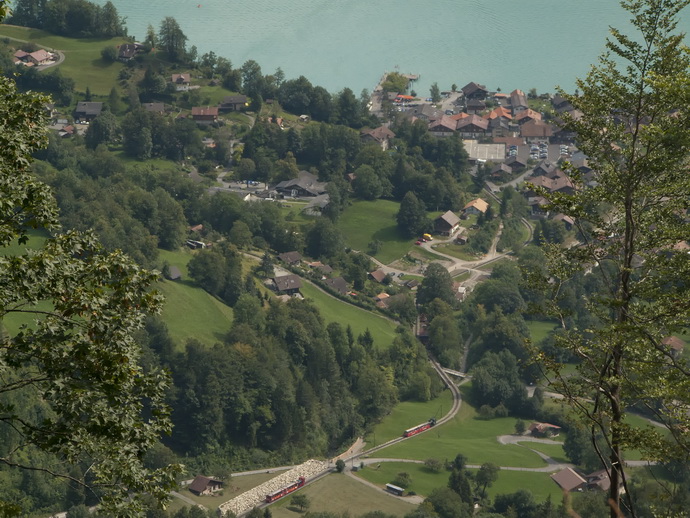 75. Este paseo nos brinda ahora una imagen de la depresión que se encuentra finalizado el lago. Al fondo se encuentra la localidad de Meiringen, tan amada por todos nosotros, en especial por los amantes del merengue, que tiene allí su origen.